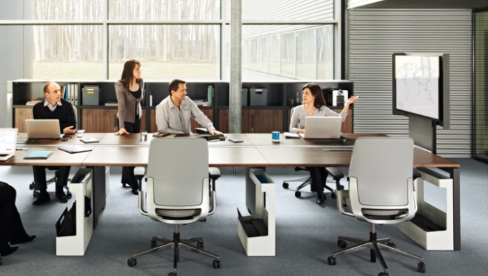 As many businesses work to reduce costs, travel is often being replaced with high tech tools like HD videoconferencing. Most HD videoconferencing systems tend to be hosted in dedicated rooms that are very costly, serve only one purpose and are more focused on the technology than on the people and the meeting experience. Steelcase sought to create a solution that could deliver an HD videoconference experience while simultaneously delivering an improved collaboration experience and a space that supports user needs beyond HD videoconferencing alone. To do this, Steelcase turned to its media:scape solution that merges furniture with technology to help teams connect and share information quickly and easily. media:scape can now host the HD videoconferencing system of a client’s choice within their media:scape setting.