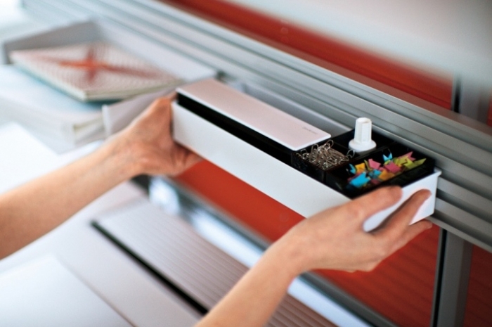 1+1 storage solutions are designed according to the frequency they are accessed. They also accommodate every shape and size of object to make storage simple, quick and intuitive. Inside storage can be used to comply with a clean-desk policy and the tools can be utilised on partitions or rails overhead, on the desk or under the desk.